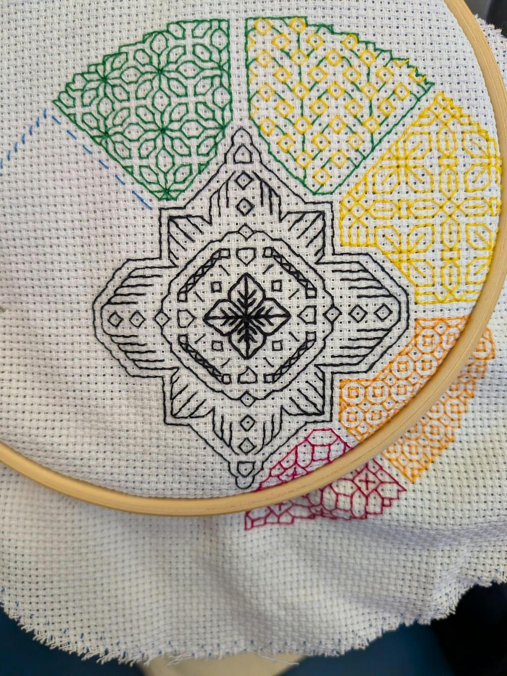 This Blackwork Pattern fits in a 5" hoop (on 14ct) but looks nice with a bit of space around it in a 6" hoop (as shown).
