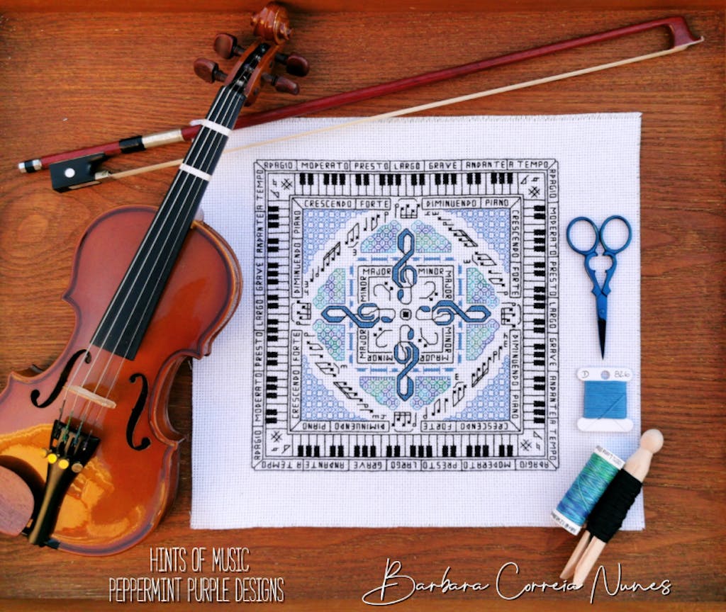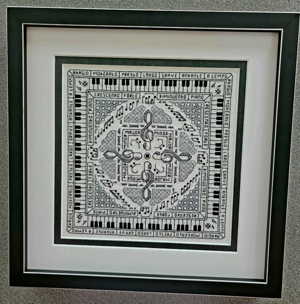 Hints of Music is such a great design! It was fun to stitch and the finished product was stunning. When I brought it to the framers they complimented me on my work and said they hadn't seen anything like it before. Gave to my mom to put above her piano. She LOVED it! I plan to do the other design in this series so she has a set. Thanks Clare for all your wonderful designs!!