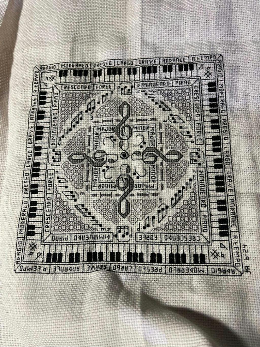 I worked this pattern for a Christmas present. It is easy to read. I wasn’t sure about the black work when I started it but it became my favorite part of the pattern. I had several complements on the keys from music teachers.