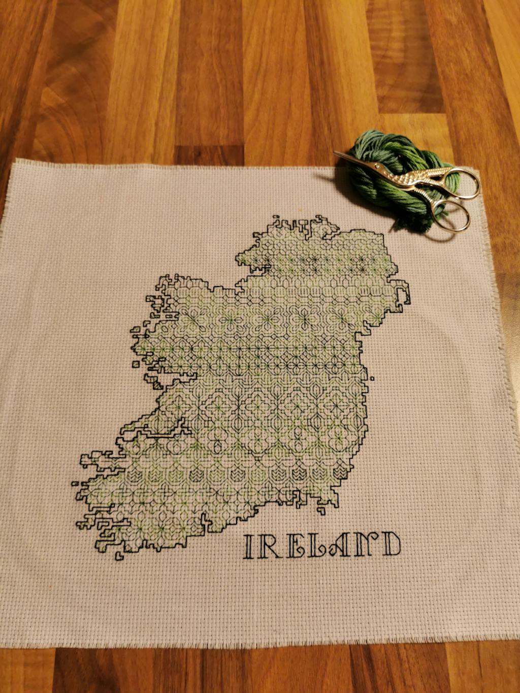 A lovely silhouette of Ireland filled with a repeating blackwork pattern