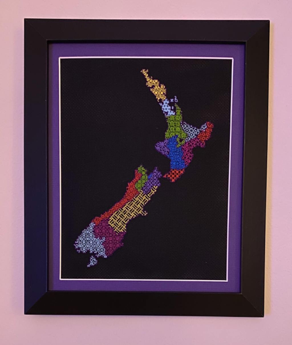 A blackwork filled map of New Zealand